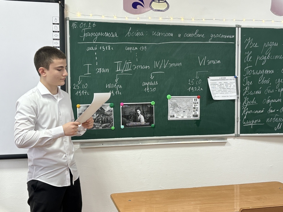 15 января 2026г проведен урок истории в 10А классе по теме: «Гражданская война: истоки и основные участники» Урок начался с мотивации учащихся: был продемонстрирован короткий видеоролик «Разрыв единого пространства: Россия в 1918 году», наглядно показавший распад империи, формирование множественных фронтов и правительств.Урок был посвящен анализу глубинных причин Гражданской войны как национальной трагедии, формированию представлений о многомерном и многоуровневом характере конфликта. Учитель акцентировал внимание на комплексе ключевых причин: политическом кризисе после падения монархии, нерешенности аграрного вопроса, последствиях выхода из Первой мировой войны, а также на социальном расколе и противоречиях, достигших пика к 1918 году.Была детально рассмотрена структура и идеологические платформы основных противоборствующих сил:· «Красные» (большевики и их союзники) – цели, социальная база, организационные принципы.· «Белые» – разнородный лагерь, его ключевые лидеры, объединяющие идеи и внутренние противоречия.· «Зеленые» и крестьянские повстанческие движения как массовая сила, боровшаяся против диктата обеих основных сторон.· Национальные движения и региональные правительства, боровшиеся за автономию или независимость.· Интервенты – цели и масштаб участия стран Антанты и других государств.Для объяснения материала учитель использовал динамическую карту «Ход Гражданской войны», сравнительную таблицу программ и лозунгов участников, а также организовал работу с фрагментами ключевых документов эпохи (Декреты Советской власти, обращения белых правительств, свидетельства современников).На уроке были использованы следующие типы электронных образовательных материалов: «Интерактивная хронологическая лента», «Динамическая карта военных действий», «Анализ исторических документов (онлайн-формат)». На основе приобретенных знаний учащиеся учились анализировать позиции разных сторон, выявлять причины их конфликта и делать выводы о сложности выбора, стоявшего перед людьми в тех условиях.Анализ эффективности работы учителя и учеников по формированию навыков анализа исторических причин и работы с многофакторными событиями, с использованием интерактивных карт и документов, показывает, что запланированные цели (понимание истоков войны и состава участников) были достигнуты. Учащиеся активно участвовали в заполнении сравнительной таблицы и дискуссии о мотивах действий различных групп населения.